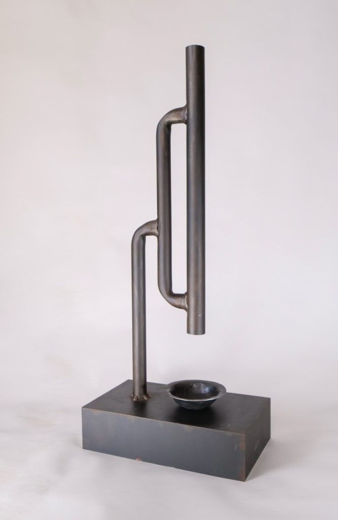 A Slow dripping fountain made of steel. Water is recirculated by a pump concealed in the base.